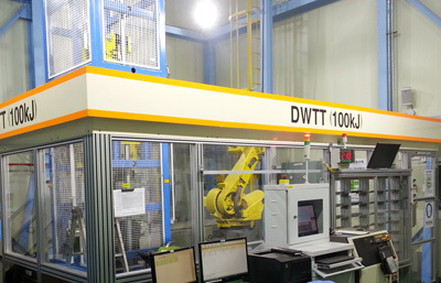 全自動のDWTT試験を行うシステムも提供しております。冷却用バスからサンプルをロボットアームが取り出し、DWTT試験を行います。得られる数値データから良否判定を行い、試験サンプルを選別する全自動システムも世界で既に稼働しております。