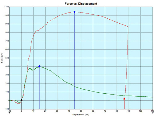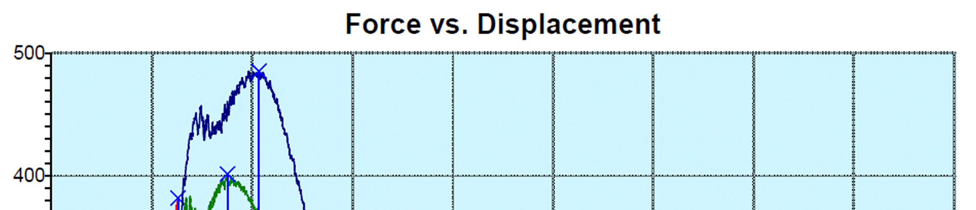 グラフの120mm~140mmに表示された赤色のマーカー(垂直の棒)はサンプル破断位置。