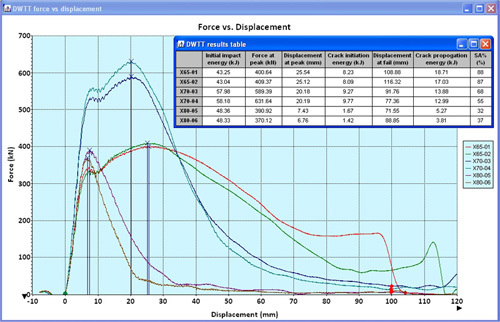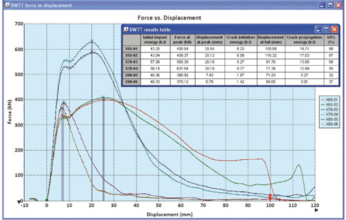 3種類のグレードが異なるラインパイプ鋼材にてAPIに準拠したDWTT試験を実施。グレードの違いを数値データで確認します。