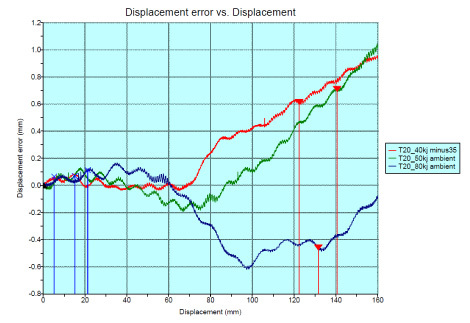 3つの異なる試験で、試験開始からサンプル破断までの「算出変位」vs「実測変位」の誤差は0.6mm~0.8mm未満です。