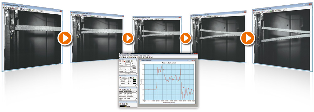 専用ソフトウェアを使い「高速ビデオ」と「衝撃試験機」を同時に制御。数値データと画像データをリンクさせた分析ができるので、エネルギーと変型の関係が明確に得られます。また、グラフの任意の位置をクリックすれば、ビデオ映像も同期して表示されます。